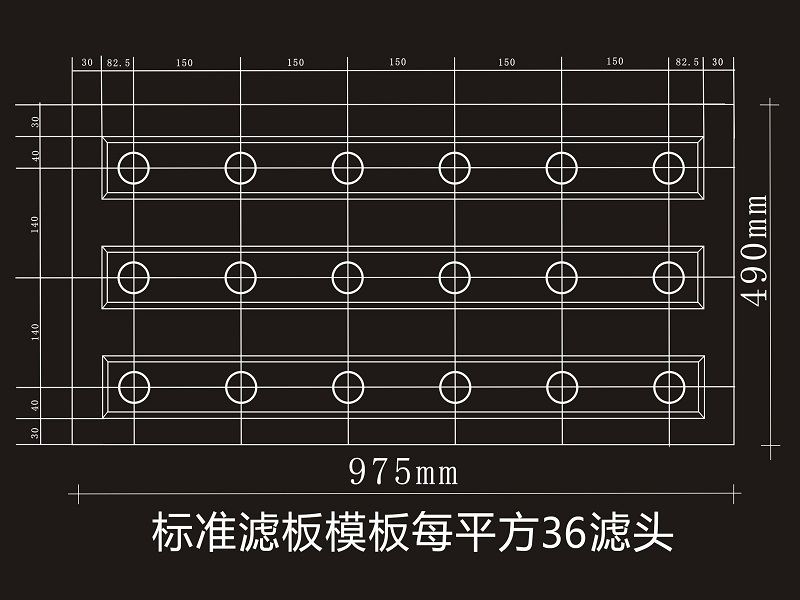 A型模板長×寬×高(975×490mm×55mm),厚度3.0mm,誤差0.2mm;可安裝濾頭數(shù)量18個/塊和21個/塊。相當(dāng)于36個濾頭/㎡(縱向間距150mm,橫向間距140mm),42個個濾頭/㎡(縱向間距130mm,橫向間距160mm)濾梁中心間距1000-1060mm。