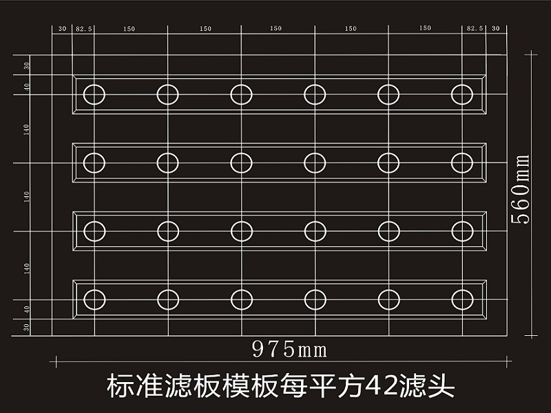 (B型整體濾板模板選型:縱向間距150mm,橫向間距140mm,相當(dāng)于42個濾頭/㎡)