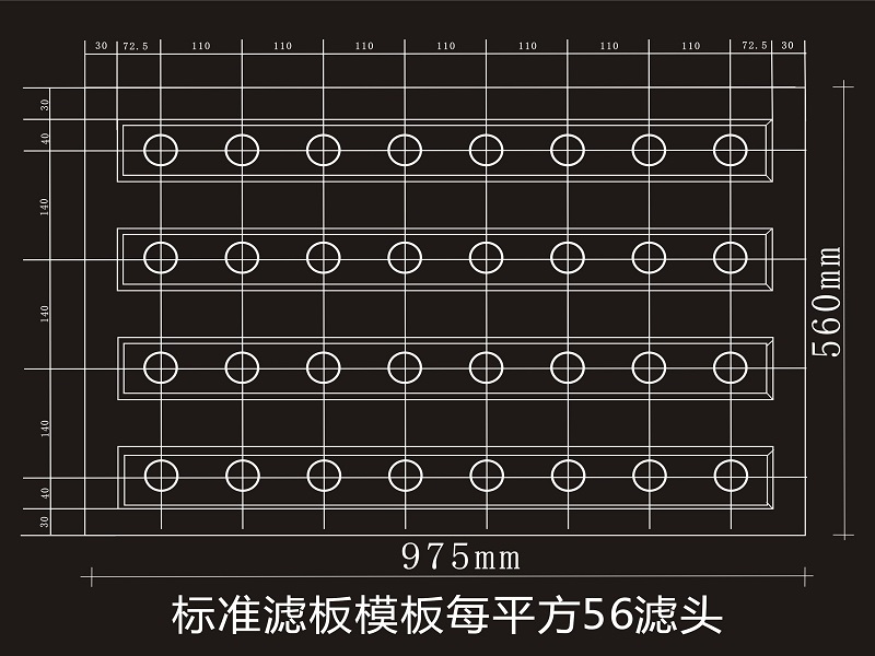 (B型整體濾板模板選型:縱向間距110mm,橫向間距140mm,56個濾頭/㎡)